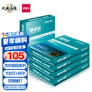 得力(deli)珊瑚海 A4 70g 雙面打印紙 行業(yè)熱銷復(fù)印紙 500張/包 5包1箱(整箱2500張)